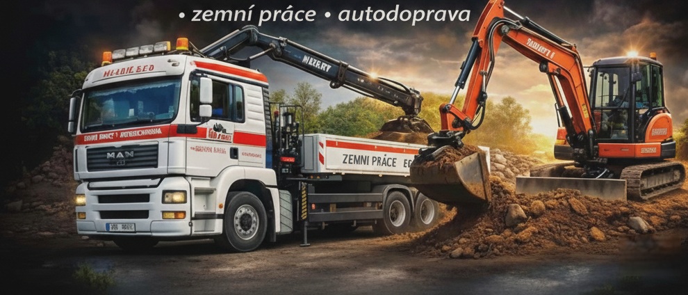 Nákladní autodoprava: Dovoz sypkých materiálů (písek, štěrk, zemina) i odvoz přebytečného materiálu. Převoz strojů.
